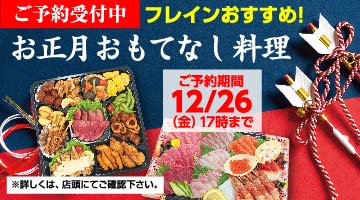 2025年 お正月おもてなし料理ご予約受付中!! 数量に限りがございます。お早めにご予約ください! 年の瀬の宴を華やかに彩る美味尽くし。 バイヤー選りすぐりの逸品をぜひご堪能ください。 フレイン全店にてご予約承り中! 詳細はこちら